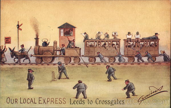 Front: NOT 90 FAST PERJE OUR LOCAL EXPRESS Leeds to Crossgates 19 Gemint Back: The Design on this Card is the Copyright of The Cynicus Publishing Co., Ltd., Tayport, Fife Post Card.