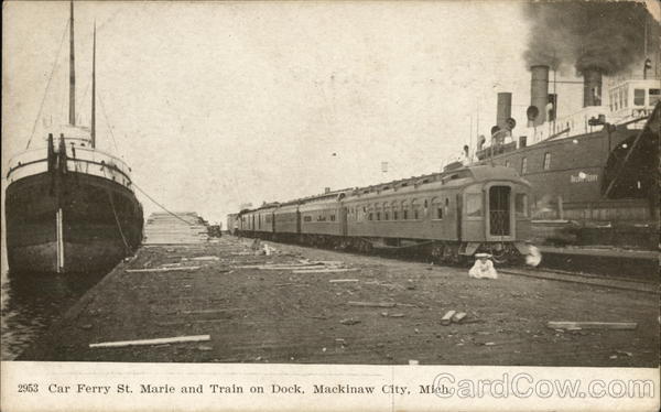 Front: 116 2953 Car Ferry St. Marie and Train on Dock, Mackinaw City, Mich. DERRY DAR Back: PEARS N-ULLBERG CO. MINNEAPOLIS 150 Penna, KR