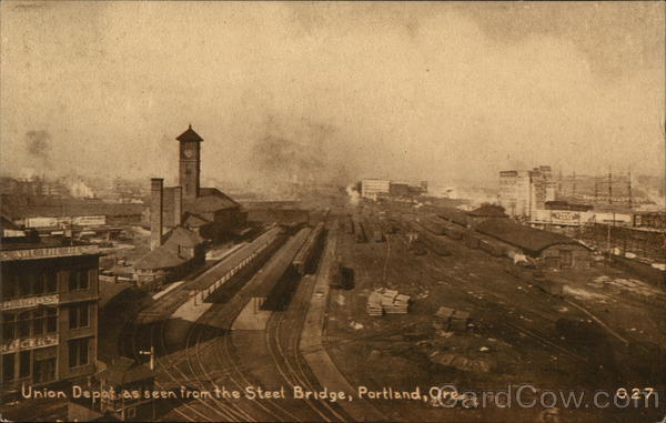 Front: S ARE THE BESTAA RABROST ROCERS 2008 (57 Union Depot as seen from the Steel Bridge, Portland, Ore Ha 22 027 Back: Pub. by Pacific Novelty Co. of S. F., Cal. Made in S. F. PLACE STAMP-HERE Ic 2c