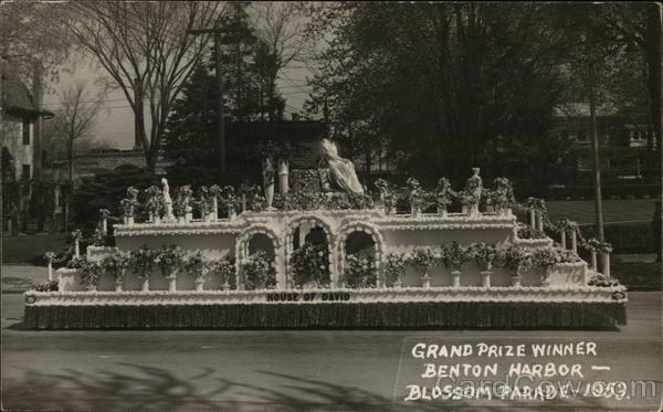 Front: HOUSEX 49 HOUSE OF DAVID 76 GRAND PRIZE WINNER BENTON HARBOR BLOSSOM PARADE-1953. - Back: HOUSE OF DAVID PARK BENTON HARBOR, MICH., U. S. A. P. O. BOX 477-SEND FOR LITERATURE EK to of
