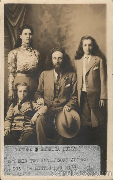 Front: EDMUND REBECCA BULLY & THEIR TWO SMALL SONS JOINED I 905 IN BENTON HAR MI CH Back: EDEN SPRINGS, ISRAELITE HOUSE OF DAVID Benton Harbor, Mich., U. S. A. Send for Literature. POST CARD