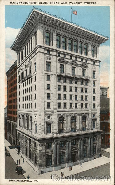 Front: MANUFACTURERS CLUB, BROAD AND WALNUT STREETS, fatum in [////[] | [ /[[[|]] |||[|]] PHILADELPHIA, PA. 177 1 IIHI PL Back: PUB. BY BUFFALO PAPER AND POST CARD CO., PHILADELPHIA, PA. Claude Grave Sofr 108455 THIS SPACE FOR CORRESPONDENCE HERE