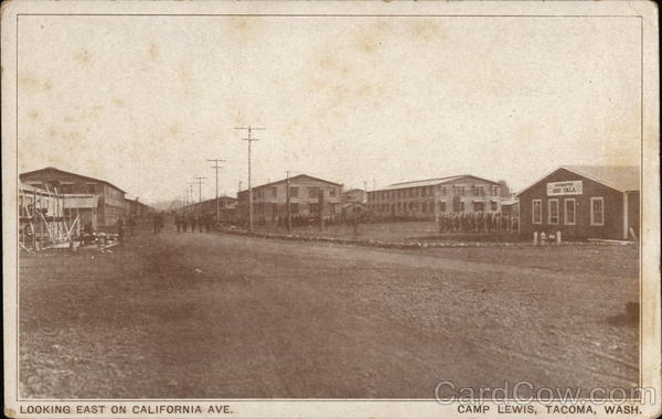 Front: Hin LOOKING EAST ON CALIFORNIA AVE. CA CAMP LEWIS, TACOMA, WASH. Back: POST CARD 3 50 THIS SPACE FOR ADDRESS ONLY