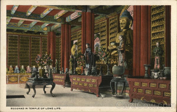 Front: DANE TEREM BUDDHAS IN TEMPLE OF LONG LIFE. LELLEE CO G Back: PUBLISHED BY CAMERA CRAFT CO., PEKING, CHINA. C. T. AMERICAN CHI R-80791 THIS SPACE FOR ADDRESS ONLY..