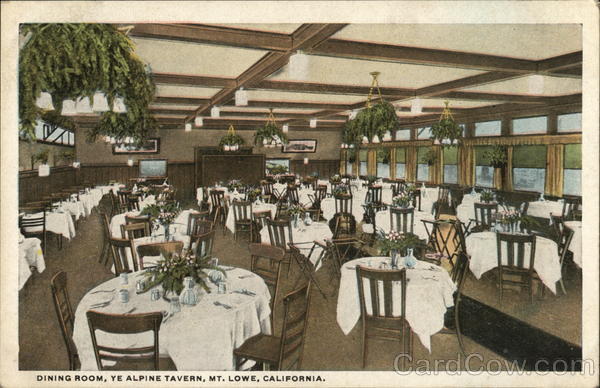 Front: VAI 41 DINING ROOM, YE ALPINE TAVERN, MT. LOWE, CALIFORNIA. 1 T JUNGLE Back: Mt Lowe Post Galifornia Gard C. T. AMERICAN R-62966 22. >1¢ 2¢