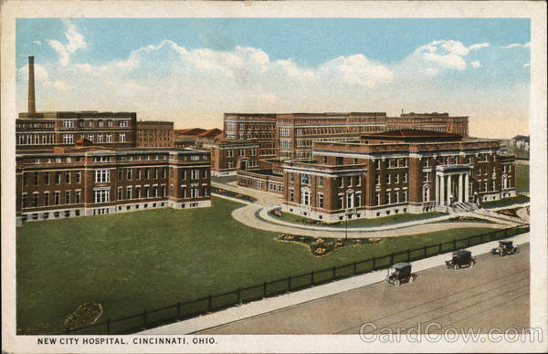 Front: HAD 17 10 HA ][B] NEW CITY HOSPITAL, CINCINNATI, OHIO. ***** Back: THE UNION NEWS CO. He R-64089 2- de AND ISLAND POSSESSIONS, CUBA, CANADA AND MEXICO FOR FOREIGN