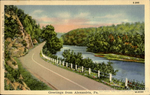 Front: S-395 Greetings from Alexandria, Pa. 6A-H1396 Dexter Press, Post Cards, Pearl River, N. Y. Back: “C.T. ART-COLORTONE” REG.U.S. PAT. OFF. MADE ONLY BY CURT TEICH & Co., INC., CHICAGO 44PC 50 C. T.RIVER SCENES
