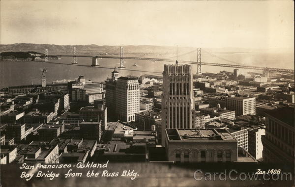 Front: 14 MA Ping my b 72 XXI MOBILGAS GENERAL PETROLEUM MWI San Francisco-Oakland Bay Bridge from the Russ Bldg. BHAK 00029 Zan 1408 Back: €1 HERE