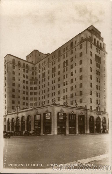Front: 626 TOIR LOCATION FE LOCATION hot Gregs ROOSEVELT HOTEL. HOLLYWOOD, CALIFORNIA. FERRI A Back: 3- THIS SPACE IS FOR COMMUNICATION ONLY THIS IS A REAL PHOTOGRAPH POSTCARD COLLECTION JEFFREY MOREAU Made in Germany