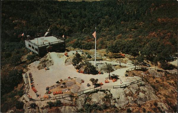 Aerial view showing the Summit House and lookout area. Historic Mt. Defiance, commanding the use of Ft. Ticonderoga, was the scene of important action during the Revolutionary War. Here General Burgoyne, on his march from Canada, forced surrender of the Fort by mounting cannon on the summit. |