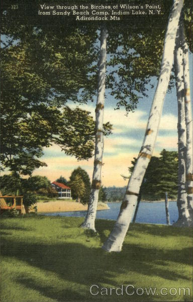 Front: 323 View through the Birches, of Wilson's Point, from Sandy Beach Camp, Indian Lake, N. Y., Adirondack Mts Back: PUB. BY STANDARD SUPPLY CO., OTTER LAKE. N. Y. 78247 S. S. CO. QUALITY CARDS MADE IN U. S. A.