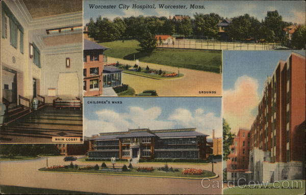 Front: Worcester City Hospital, Worcester, Mass. GROUNDS CHILDREN'S WARD MAIN LOBBY JACQUES MEMORIAL BUILDING Back: PERKINS & BUTLER, INC., WORCESTER, MASS. 1 B-H1248