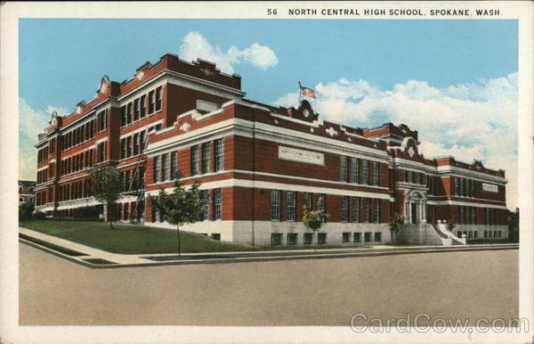 Front: 56 NORTH CENTRAL HIGH SCHOOL, SPOKANE, WASH. Back: 82951 PUBLISHED BY J. L. ROBBINS CO., SPOKANE, WASH. c. T. AMERICAN ART COLORED CIRC T.