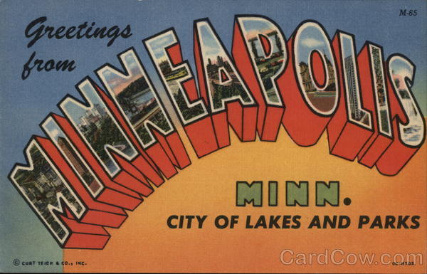 Front: Greetings M-65 LAP FINE MINN. CITY OF LAKES AND PARKS CURT TEICH & CO., INc. OC-H703 Back: ST. MARIE's, GOPHER NEWs co., MINNEAPOLIS-ST. PAUL, MINN.
