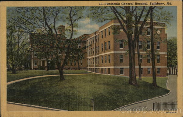 Front: 13-Peninsula General Hospital, Salisbury, Md. 1B-H2604 Back: THE HARRY P., CANN & BRO. CO., BALTIMORE, MD.