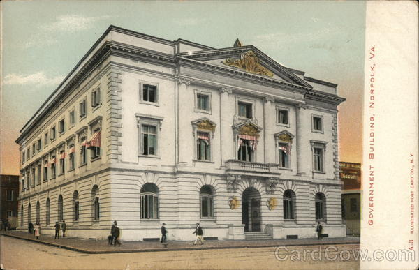 Front: FR Biscuit 2344** EMY OF MUSIC GOVERNMENT BUILDING, NORFOLK, VA. A-3 ILLUSTRATED POST CARD CO., N. Y. Back: Sod 251 DOMESTIC AND Two CENTS