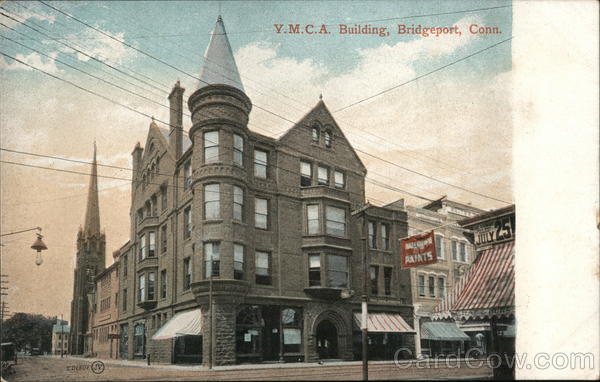 Front: 201801 (J.V Y.M.C.A. Building, Bridgeport, Conn. MALL PAINTS !! 725 SECUNOS JULY TEAL & BURS Back: The Valentine & Sons' Publishing Co., Ltd. معراطة AMS SOUVENIR POST GARD 1