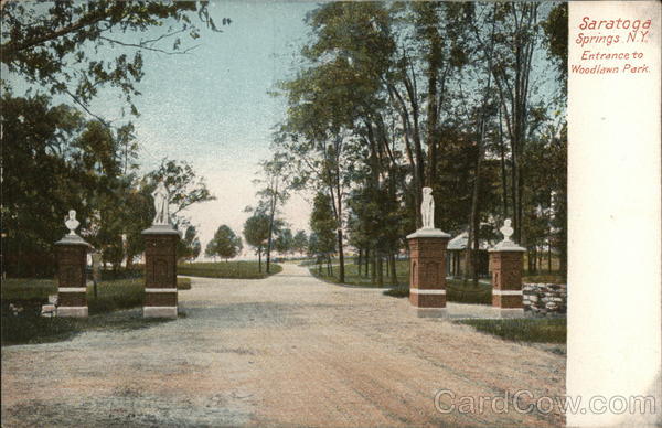 Front: Saratoga Springs N.Y. Entrance to Woodlawn Park. Back: Robson & Adee, Publishers,Saratoga,Springs, N. Y. Made in Germany. N:1202. One Cent for United States, and Island Possessions, Cuba, Canada and For Foreign.