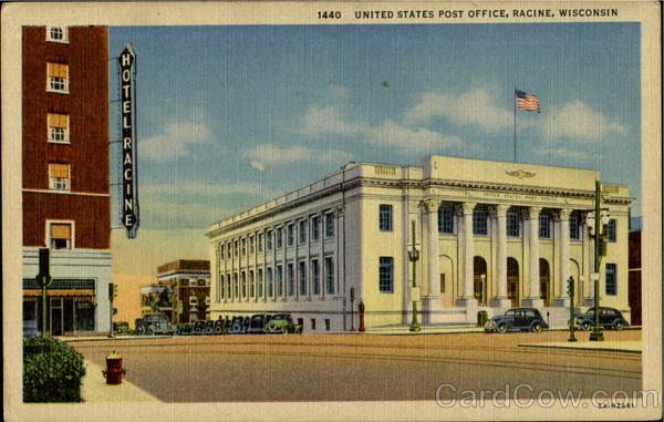 Front: 1440 UNITED STATES POST OFFICE, RACINE, WISCONSIN UNITED STATAN POST 5A-H2661 COTELRACIN E Back: SERVICE PAPER CO., RACINE, WIS.