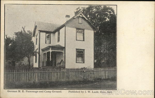 Front: German M. E. Parsonage and Camp Ground. Published by J. W. Ladd, Dale, Ind. Back: T.N.Y.N.CO. 14 24