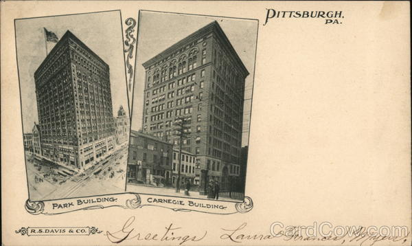 Front: PARK BUILDING R.S.DAVIS & Co. PARKER BA E795C 25 ENEE COMPANY CARNEGIE BUILDING. PITTSBURGH Greetings Laura Ferances, Myers, Back: ΠΑΝ RG 44 CA N.U. 32 799 Mice Emma, Rolle, Lewis St. Phillipslung. New Jersey, TWO CENTS