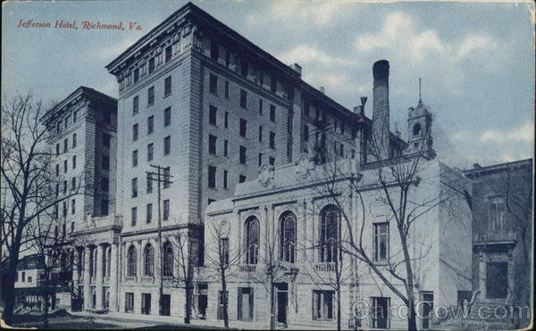 Front: Jefferson Hotel, Richmond, Va. 20 /// 11 11 TITI TE ***** Back: TOM JONES, PUB. CIN. O. HFRE. FOREIGN, TWO CENTS. 2