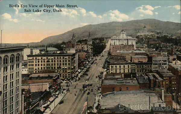 Front: Bird's Eye View of Upper Main Street, Salt Lake City, Utah. 19 MANA b Back: 509 PUBLISHED BY SOUVENIR NOVELTY CO., SALT LAKE CITY, UTAH.. BUSY SOUVENIR TIME NOVELTY COC QUALITY MESSAGES A-55867 PHOTOCHROM 2.50