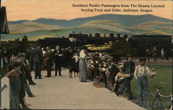 Front: Southern Pacific Passengers from The Shasta Limited buying Fruit and Cider, Ashland, Oregon. 1717 {" 009 Back: PUBLISHED BY LOUIS SCHEINER, PORTLAND, ORE. A-29565 2.12 THIS SPACE FOR ADDRESS ONLY