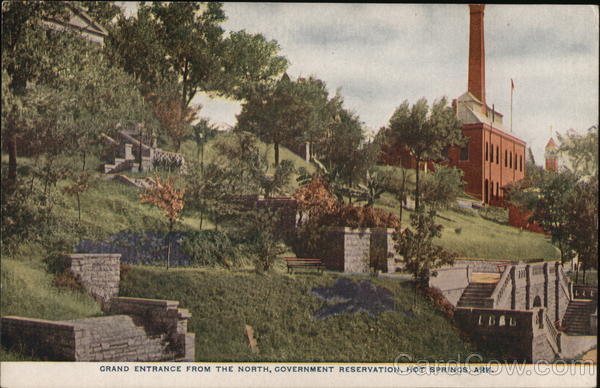 Front: LBBG GRAND ENTRANCE FROM THE NORTH, GOVERNMENT RESERVATION, HOT SPRINGS, ARK. Back: W. E. SHANNAHAN, PRINTER, PUBLISHER, HOT SPRINGS, ARK. THIS SPACE CAN BE USED FOR A WRITTEN MESSAGE TWO CENTS