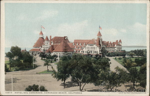 Front: EEEEEEE BADUTIE 13577 HOTEL DEL CORONADO, CORONADO BEACH, CALIFORNIA COPR DETROIT PHOTOGRAPHIC CO. Back: 'PHOSTINT" TRADE MARK REG US PAT, OFF MADE ONLY BY DETROIT PUBLISHING CO THIS SPACE MAY BE USED FOR MESSAGE. XVII HERE
