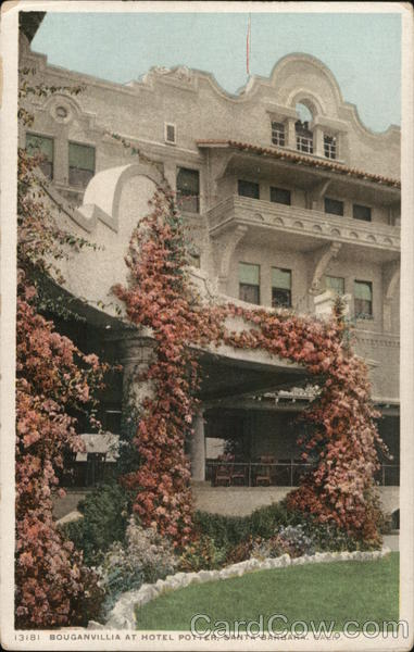 Front: 13181 BOUGANVILLIA AT HOTEL POTTER, SANTA BARBARA. CALIF. Back: MADE ONLY BY DETROIT PUBLISHING CO. "PHOSTINT" CARD. TRADE MARK REG. U. S. PAT. OFF. THIS SPACE MAY BE USED FOR MESSAGE. AND CANADA. FOREIGN. TWO CENTS