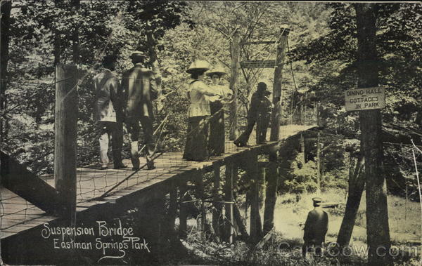 Front: Suspension Bridge Eastman Springs Tark DINING HALL COTTAGES IN PARK W Back: Fast SAINT JUL25 6-30P 10 MICH! 19 JOSEPH M. Heller PRA *** *** JOSEFH MICH. Waring a very mies F. Bernies nice ture. 629 Oakdale an Chirag ell ONE CENT