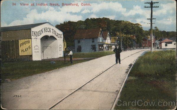 Front: 34 View at Indian Neck, Branford, Conn. PLAYS 3962 PLAYS N NECK THEATRE W2 WD KR DE MA Back: Pub. by Danziger & Berman, New Haven, Conn. ORIGINALITY QUALITY D&B Chrom New Process SERVICE 189 2 GENTS