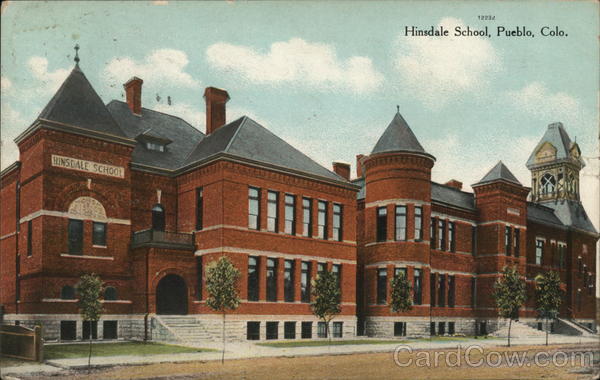 Front: HINSDALE SCHOOL IIII 12232 Hinsdale School, Pueblo, Colo. Back: PUBLISHED BY THE HYDE PAPER CO., PUEBLO, COLO. I did not see this place but it looks guod Kevy Col SALER ONE CENTU Miss Zillian M сти ay 110 N. bollege Mason besty Nawa