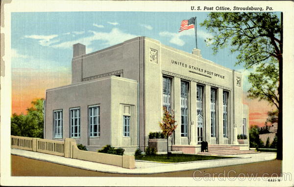 Front: U. S. Post Office, Stroudsburg, Pa. UNITED STATES POST OFFICE 6A21-N Back: A. B. WYCKOFF, STROUDSBURG, PA. GENUINE CURTEICH.CHICAGO 'C.T. AMERICAN ART