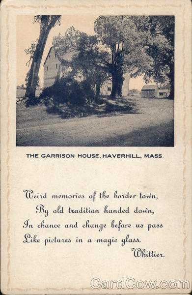 Front: THE GARRISON HOUSE, HAVERHILL, MASS. Weird memories of the border town, By old tradition handed down, In chance and change before us pass Like pictures in a magic glass. Whittier. Back: N. E, PAPER & STATIONERY CO. MFRS AYER, MASS. HERE