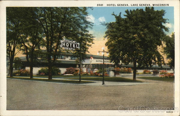 Front: 3581 HOTEL GENEVA, LAKE GENEVA, WISCONSIN ENTRANCE GENEVA HOTEL GENES 80820 Back: 150 E. A. BISHOP PUBLISHER, RACINE, WISCONSIN