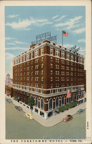Front: YORKTOWN E 6BE85HEEi 上 CEUB TELE YORKT O W NE HOTEL YORK, PA. 4A288-N Back: THE YORKTOWNE HOTEL York, Pa. 275 MODERN ROOMS WITH BATH Garage Attached ONE OF PENNSYLVANIA'S BETTER HOTELS 75
