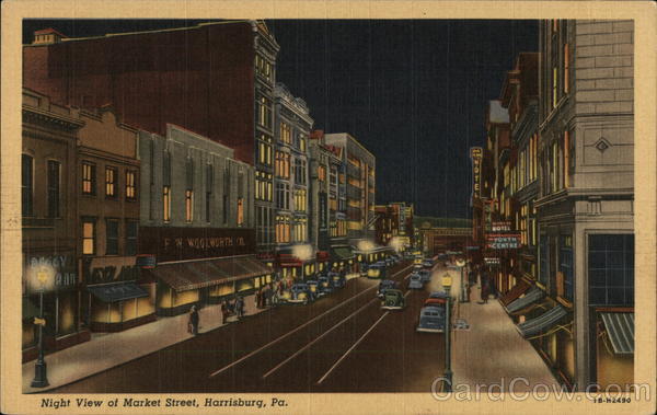 Front: FW WOOLWORTH CO. YOUTH CENTRE 1B-H2490 Night View of Market Street, Harrisburg, Pa. TOTE Back: DISTRIBUTED BY J. B. HOFFMAN, HARRISBURG, PA. We EELS