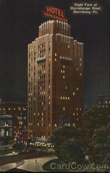 Front: Night View of Harrisburger Hotel, Harrisburg, Pa. HARRISBURGER EE 3B-H1355 Back: DISTRIBUTED BY J. B. HOFFMAN & SON, HARRISBURG, PA.