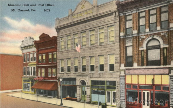 Front: Masonic Hall and Post Office. Mt. Carmel, Pa. MC6 POST OFFIE Back: lits THE MEBANE GREETING CARD COMPANY, WILKES-BARRE, PA. 79606