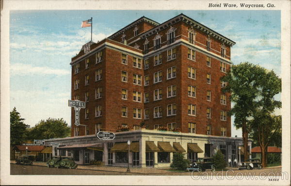 Front: Hotel Ware, Waycross, Ga. E旺 EE GEORGIA COMPANT WESTERH UMION 18 SERVICE Sarow 3A 382 Back: 300 ® 222