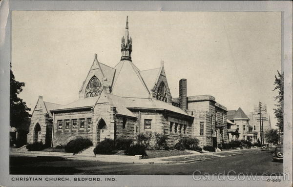 Front: 277 CHRISTIAN CHURCH, BEDFORD, IND. G-585 Back: VIEW CLEAR MFD. BY WAYNE PAPER BOX & PRTG. CORP., FORT WAYNE, IND. D-590