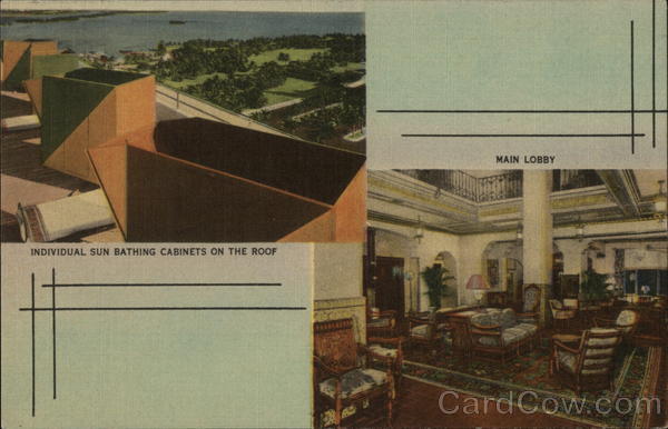 Miami's leading Bayfront Hotel - 250 large rooms each with bath and radio. Air conditioned rooms, coffee shop and banquet rooms in summer. Steam heat in winter. Individual Sun Bathing Cabinets on the Roof. Biscayne Boulevard at Fifth Street. |
