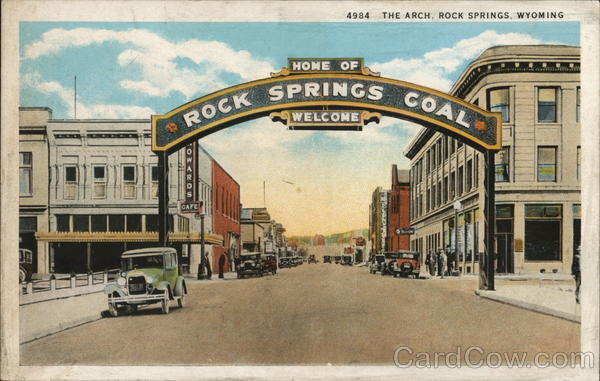 Front: TOWARDS ROCK SPRINGS CAFE 4984 THE ARCH, ROCK SPRINGS, WYOMING ***** HOME OF WELCOME UGO COAL # # # # ** Back: 1.5 HA THIS PACE FOR ADDRESS *HSYM C. T. AMERICAN ART COLORED gh