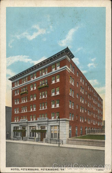 Front: HAL AR AR WGR HER HOTEL PETERSBURG, PETERSBURG, VA. 51114174-30-200 33 13 - 20-11-200 18 1 13 37 00 118006 Back: PETERSBURG'S LEADING AND ONLY FIRE-PROOF HOTEL GORDON C. MORGAN MANAGER PUBLISHED BY WM. E. LUM, JR., INC., PETERSBURG, VA. 05