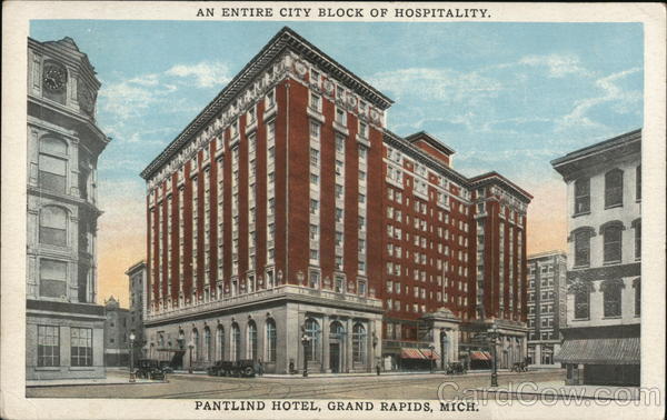 Front: AN ENTIRE CITY BLOCK OF HOSPITALITY. CEL LOLOLO F00 *82 522 TARIK 44/41/14-AU 42/14/41/4 45/11/14/11 PANTLIND HOTEL, GRAND RAPIDS, MICH. 100 14141414 888888 Back: E. C. KROPP CO., MILWAUKEE 5960 3₁ Dr Co