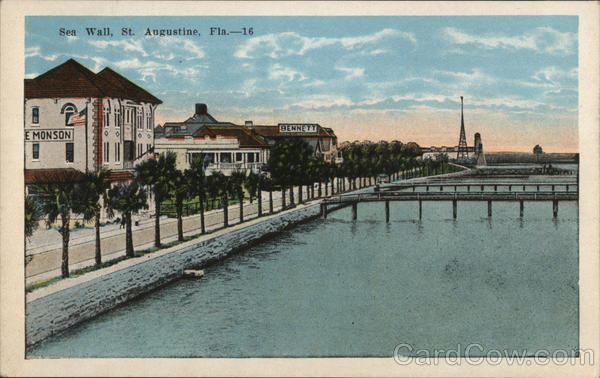 Front: Sea Wall, St. Augustine, Fla.-16 12 E MONSON BENNETT IN SAL Back: E. C. KROPP CO., MILWAUKEE SEA WALL, ST. AUGUSTINE, FLA. Sea Wall, showing Hotel Monson, Bennett House, Matanzas Apartments and Fort Marion in the distance. 422 22395 R