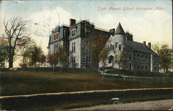 Front: 20 State Normal School, Worcester, Mass. Back: 6.00 RAC STFRIM Come POST CARD - CARTE POSTALANIB this Thursday up this Eveing, Jan. 20th. O E 12 M STAB llows wanted to get together then George E. Sweet, Sutton, Cutting. hass.