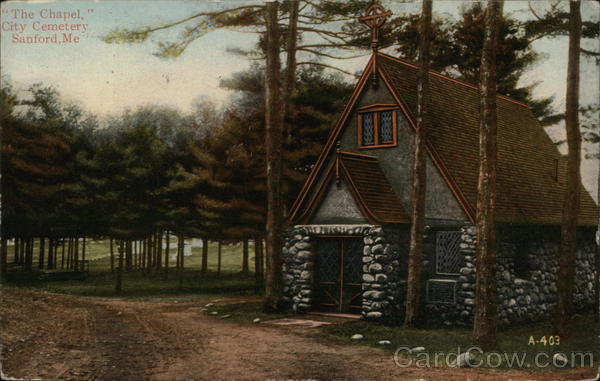 Front: "The Chapel, City Cemetery. Sanford, Me A-403 Back: 4-283 Mason Bros. & Co., Boston, Mass. night. Will be home monday having a fine time arrived allright and Fredrugamie Tips & સતત JIAM 61 PRILE We D. Matrigan, 26 Prospect St., Dover, Y.H. с
